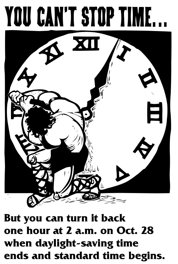 A cartoon of a strong man struggling to stop the hands of a large clock. The caption reads: You can't stop time... but you can turn it back one hour at 2 a.m. Oct. 28 when daylight-saving time ends and standard time begins."